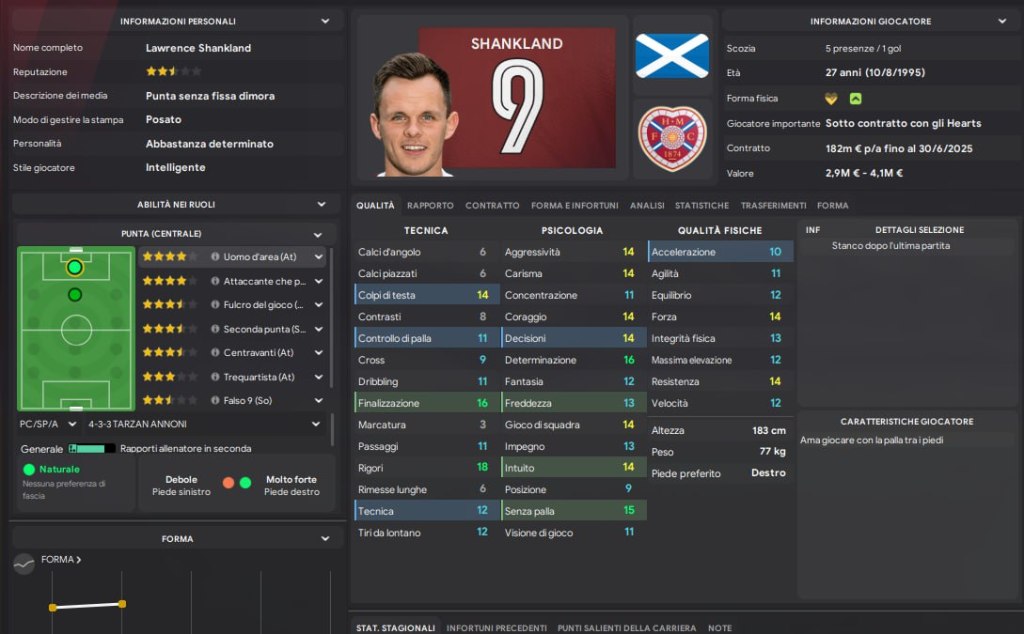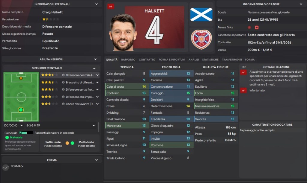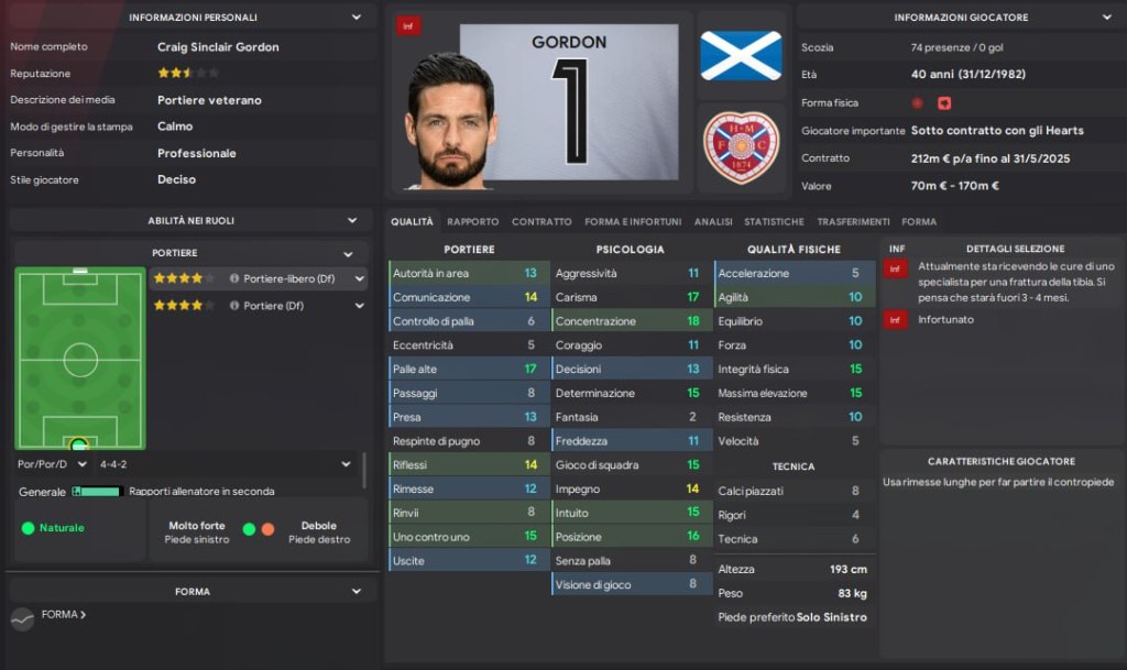 Quando prendiamo visione della rosa, capiamo subito che è stata costruita bene, numericamente e a livello di caratteristiche posso subito dire che è stata pensata per un 4231 o un 433. L’unica pecca è data da alcuni infortuni che ci costringono in sede della prima riunione tecnica con il nostro DS, Joe Savage, di andare alla ricerca di un terzo portiere che copra l infortunio del capitano e veterano Gordon, e un terzino destro che sostituisca Atkinson, in quanto il prestito che abbiamo, Lembikisa, non è di nostro gradimento. Per l’altro lungodegente, il centrale di difesa Halkett, i sostituti li abbiamo. Con 2 giocatori per ruolo, in attesa di poter recuperare i lungodegenti, siamo contenti della rosa, nel discorso di presentazione siamo stati chiari, la nostra filosofia è quella di comandare il gioco, contro chiunque, in casa e in trasferta, in Scozia e oltre i confini nel palcoscenico europeo.