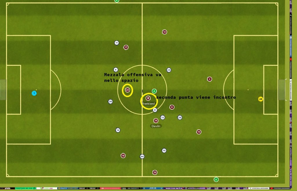 Un altro sviluppo offensivo è dato dai terzini, che spingono e vanno sul fondo. Si puo creare una situazione in cui in fase offesiva si possono vedere i terzini larghi, il tridente composto dagli esterni d’attacco e la punta e appena dietro, a rimorchio, il CCQ e la mezzala.