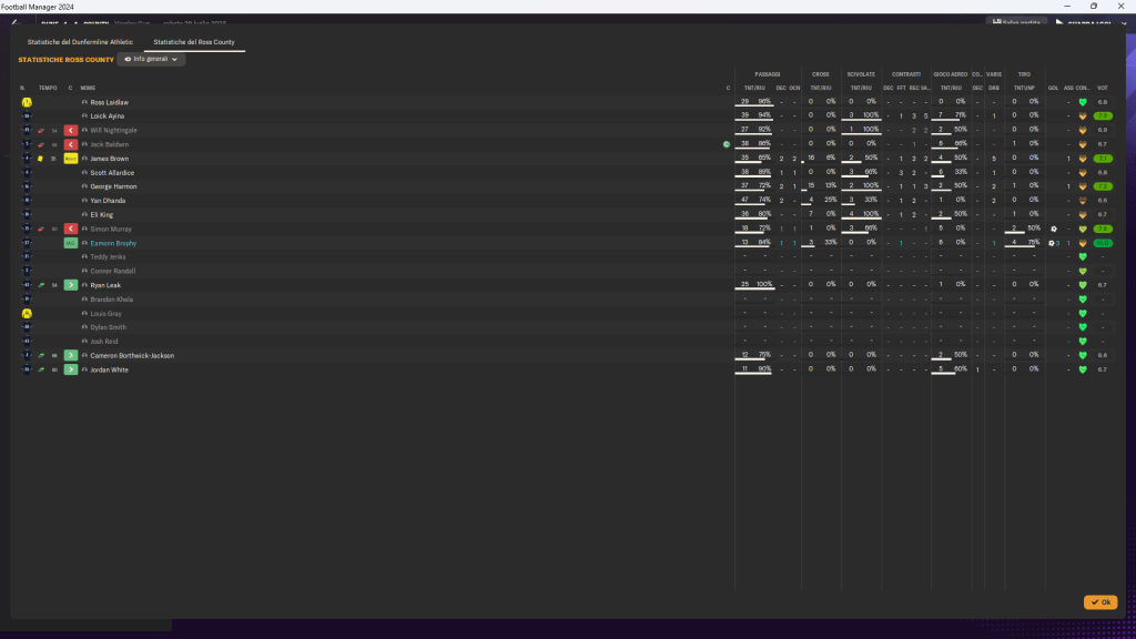 - Calci d’angolo: 10 (Ross County) vs. 6 (Dunfermline)