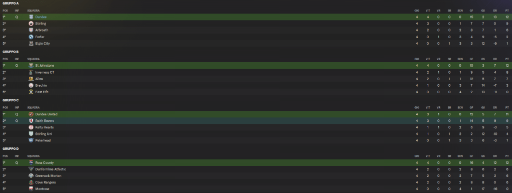 - Gruppo B: St Johnstone ha dominato con 12 punti, mentre Inverness CT ha ottenuto la seconda posizione con 8 punti.