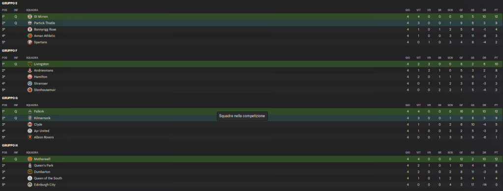 - Gruppo H: Motherwell ha dominato con 12 punti, mentre il Queen’s Park ha chiuso con 8.