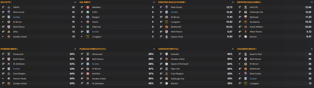 - Squadra più precisa nei passaggi: Kilmarnock, Raith Rovers e Dundee guidano con un 88% di passaggi completati.