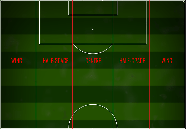 il campo può essere diviso non solo orizzontalmente in terzi (difensivo, centrale e offensivo), ma anche verticalmente in cinque zone principali, che aiutano a determinare come una squadra costruisce il gioco e si muove in fase offensiva e difensiva.
