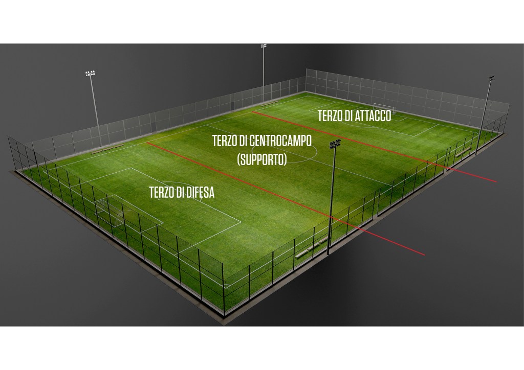 - Terzo difensivo – La fase di costruzione e difesa avviene qui. Coinvolge i difensori centrali, il portiere e spesso i terzini, soprattutto in formazioni che prevedono un’uscita palla controllata. Può essere influenzato dall’uso di un libero o da difensori che si allargano per facilitare il possesso palla.