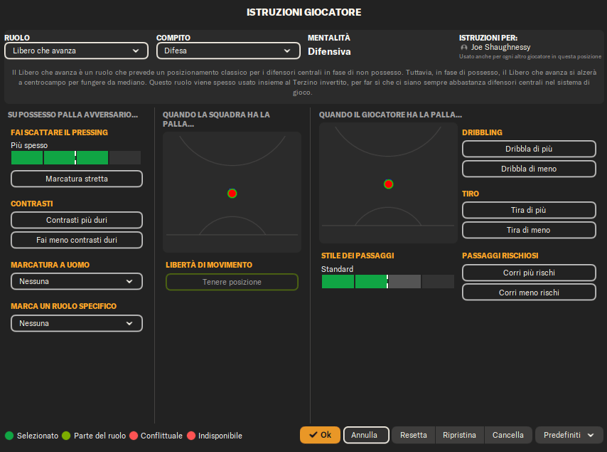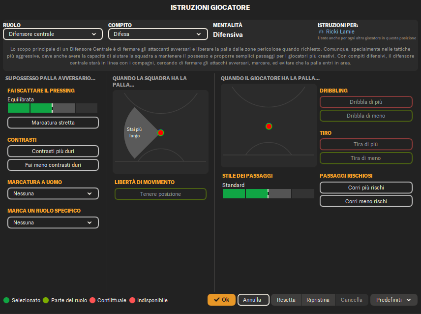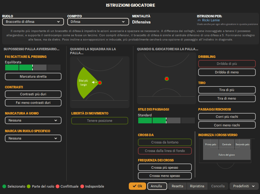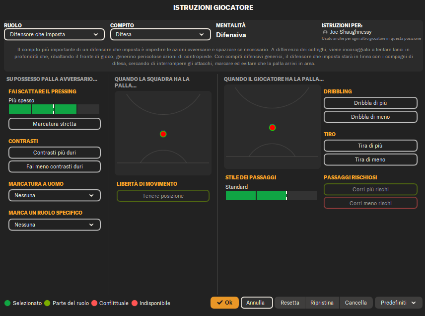 - Difendere (Defend): Il compito più equilibrato, dove il giocatore segue la linea difensiva e le istruzioni della squadra senza sbilanciarsi troppo in avanti o indietro. È la scelta più comune per garantire stabilità alla difesa.
