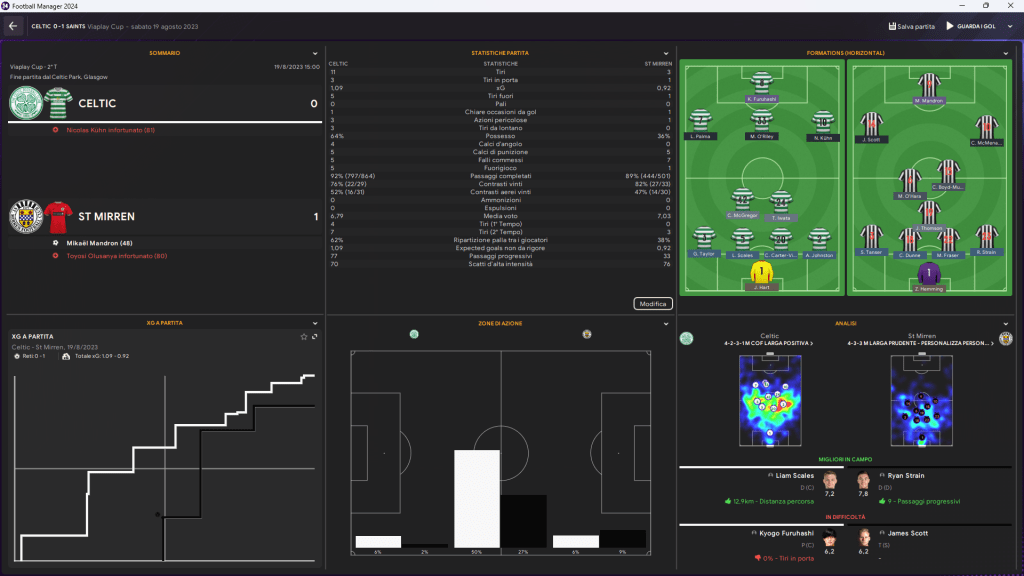 “Insoddisfatto del primo tempo, troppo brutto e l’ho fatto notare all’intervallo ai ragazzi. Il St. Johnstone chiudeva bene tutti gli spazi e noi siamo stati molto imprecisi negli appoggi e nelle verticalizzazioni, infatti abbiamo subito diversi contropiedi rischiando anche di subire più gol. Nel secondo tempo ho messo Clarkson più in propensione offensiva sulla destra per sfruttare le sue qualità, e nel complesso tutti hanno fatto meglio. C’è da migliorare l’approccio alla gara dall’inizio e dobbiamo farlo subito visto che tra pochi giorni abbiamo la durissima partita contro la Dinamo Zagabria in Europa League“