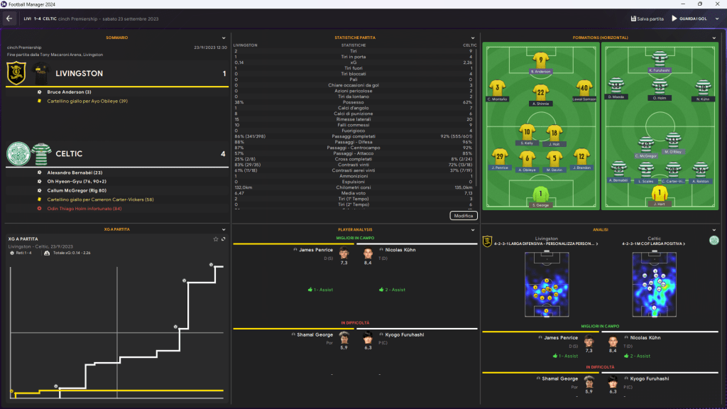 Minuto 23: Alexandro Bernabéi sblocca la partita, dando il via a una prestazione dominante. Il Livingston prova a resistere, ma è solo un’illusione. Nel secondo tempo, il Celtic aumenta i giri e chiude i conti con la doppietta di Oh Hyeon-Gyu (76’, 90+2’) e il rigore trasformato da Callum McGregor (80’). Il gol della bandiera di Bruce Anderson serve solo per le statistiche.