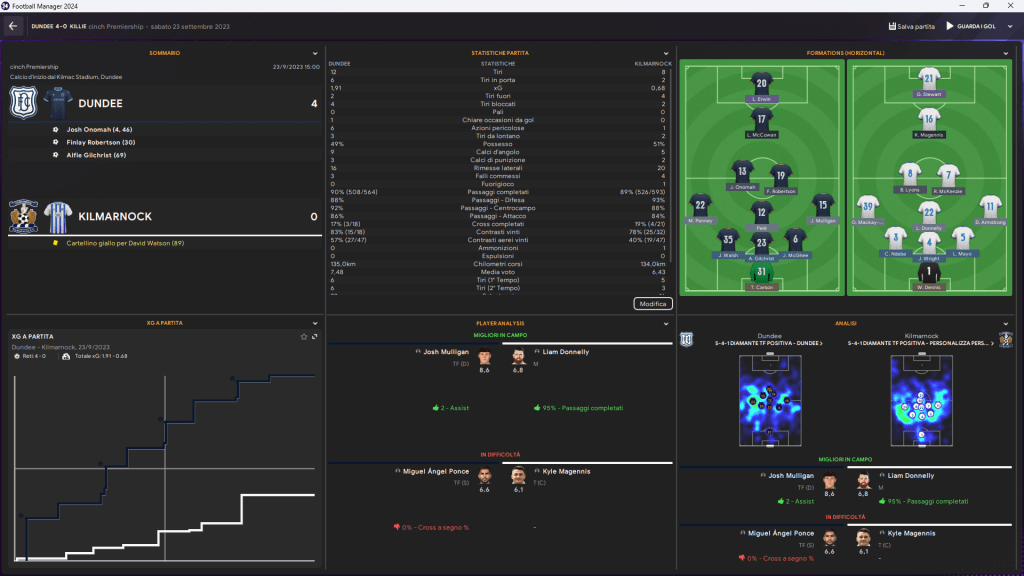 Basta un tempo a Josh Onomah per spazzare via ogni resistenza: due gol (4’, 46’) che indirizzano subito la gara. Il Kilmarnock prova a restare a galla, ma il Dundee è implacabile. Finlay Robertson (30’) e Alfie Gilchrist (83’) completano la festa.