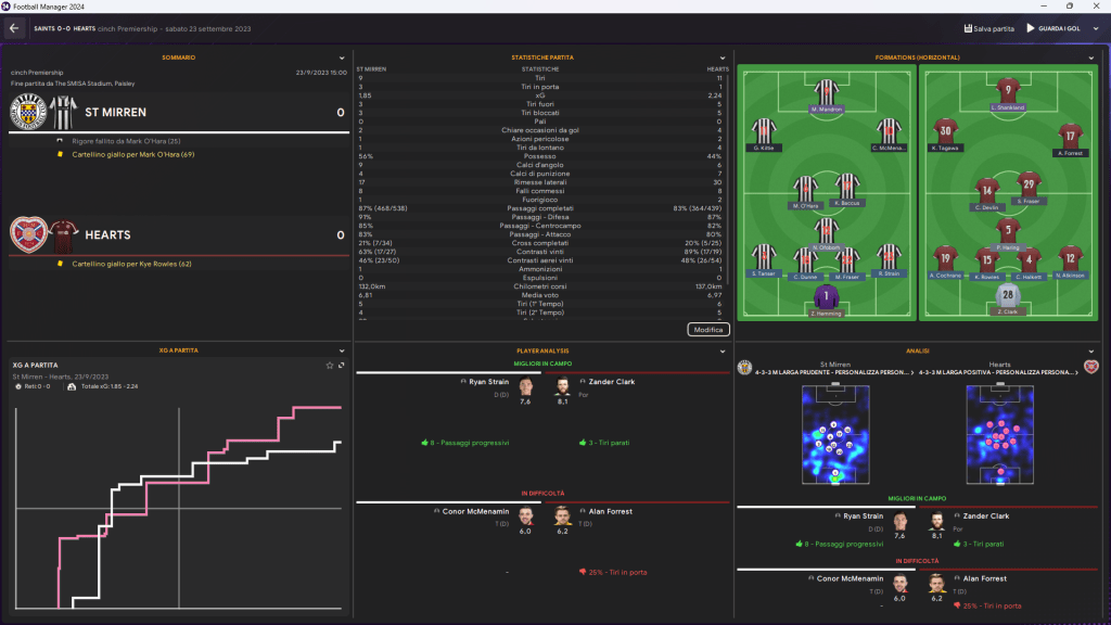 Il St Mirren ha l’occasione della vita con Mark O’Hara, che però sbaglia un rigore al 25’. Gli Hearts, dal canto loro, spingono ma sbattono contro il muro avversario. Zander Clark tiene a galla gli ospiti con interventi decisivi, mentre Ryan Strain brilla in fase difensiva.