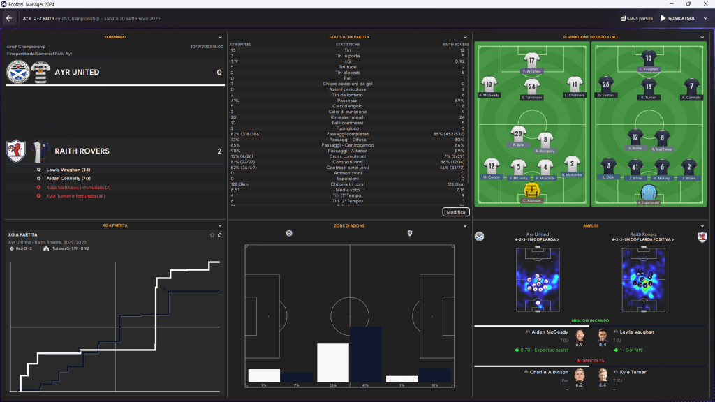 Un’altra grande sorpresa è arrivata da Raith Rovers, che si è imposto in trasferta contro Ayr United con una prestazione matura e determinata. Lewis Vaughan e Aidan Connolly hanno trovato i gol che hanno deciso la partita, con un 2-0 che ha lasciato poco spazio alle recriminazioni per Ayr United. Nonostante qualche tentativo di reazione, Ayr United non è mai riuscito a entrare in partita, cedendo alla superiorità dei ragazzi di Raith Rovers.