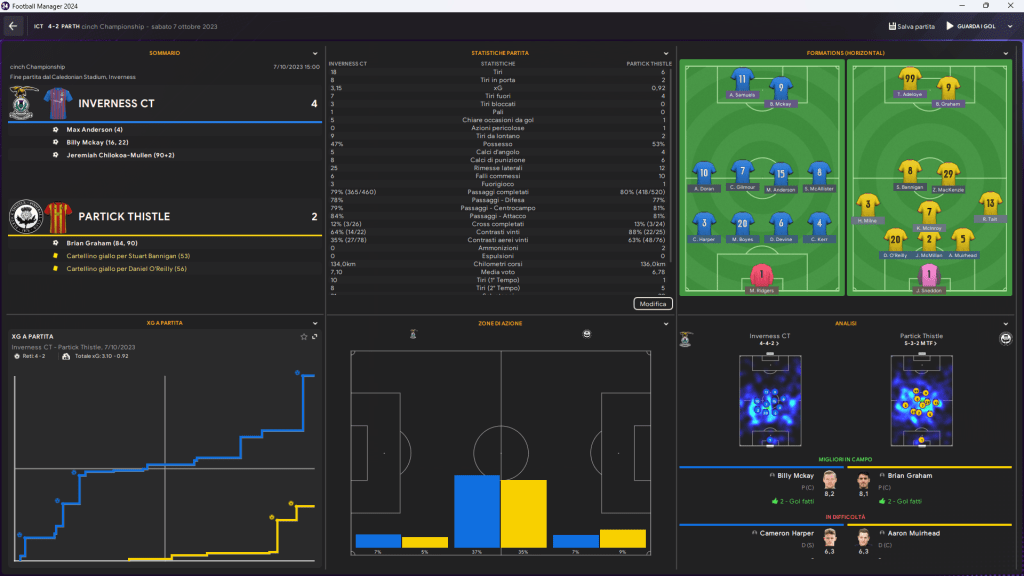 Al Caledonian Stadium, Inverness è pronto a far vedere di che pasta è fatta. La partita si infiamma fin dai primi minuti, con Max Anderson che segna il primo gol al 4’. Un inizio da manuale, seguito dalla doppietta di Billy McKay che porta la partita sul 3-0 al 22′. Partick Thistle non ci sta, e con Brian Graham accorcia le distanze al 84′, segnando il primo gol per gli ospiti. Ma Inverness non è disposto a cedere, e Jeremiah Chilokoa-Mullen mette la parola fine sulla partita al 90+2’, facendo esplodere il pubblico. Un 4-2 che racconta della forza di una squadra che non si lascia intimidire e che si rialza sempre, anche quando tutto sembra perduto.