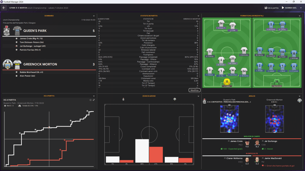 Ma i padroni di casa non mollano. Un’altra sfuriata di orgoglio e passione si materializza al 36’ con Tom Dickson-Peters, che riporta in vantaggio il Queen’s Park. La battaglia però non è finita. A metà del secondo tempo, il destino sembra giocare un brutto scherzo a Greenock Morton quando Jai Quitongo segna un autogol al 49’, complicando ulteriormente le cose per gli ospiti. Nonostante la montagna da scalare, Morton non si dà per vinto e tenta il tutto per tutto, ma è Patrick Farries, al 90+1’, a chiudere definitivamente la partita con un gol che vale tre punti.