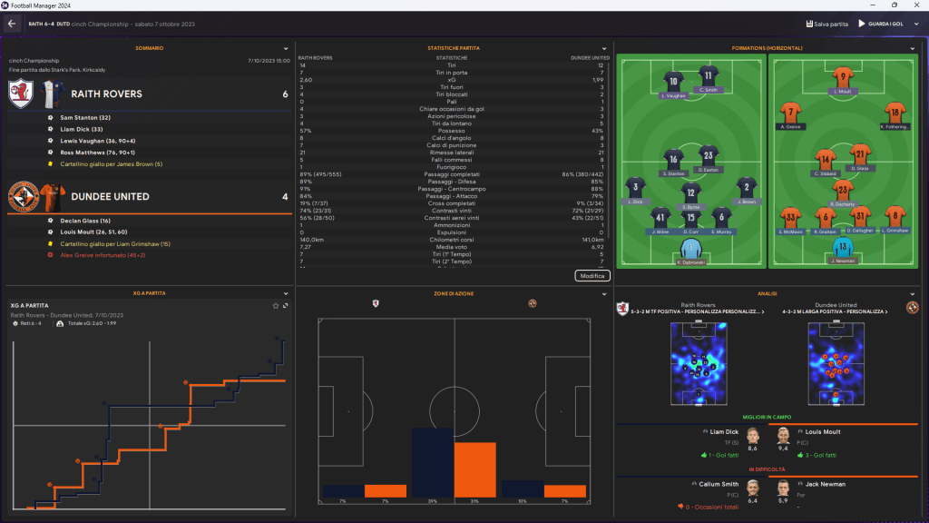 Il Dundee United, però, non è disposto a cedere. Dopo una prima fase di difficoltà, reagisce con determinazione. Declan Glass accorcia le distanze al 16’, e al 26’ Louis Moult firma il gol del pareggio con un colpo di testa implacabile. Ma il Raith Rovers non si fa sorprendere, e al 51’ Liam Dick segna ancora, riportando i locali in vantaggio. Nonostante una nuova reazione del Dundee, con Moult che segna ancora al 60′, la partita si accende nel finale: al 76’, Ross Matthews segna il 5-3, un gol che sembrava mettere fine alla speranza del Dundee. Tuttavia, gli ospiti non mollano mai, e un altro gol di Louis Moult (90+2’) riaccende momentaneamente la fiamma, ma al 90+4’ un gol di Ross Matthews sigilla la vittoria per 6-4.