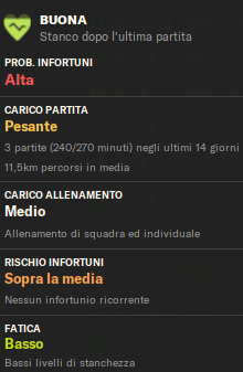 Un valore apparentemente positivo. Tuttavia, la fatica si riferisce alla percezione soggettiva del giocatore: non si sente stanco, ma ciò non significa che il suo corpo sia realmente in grado di reggere altri 90 minuti ad alta intensità.