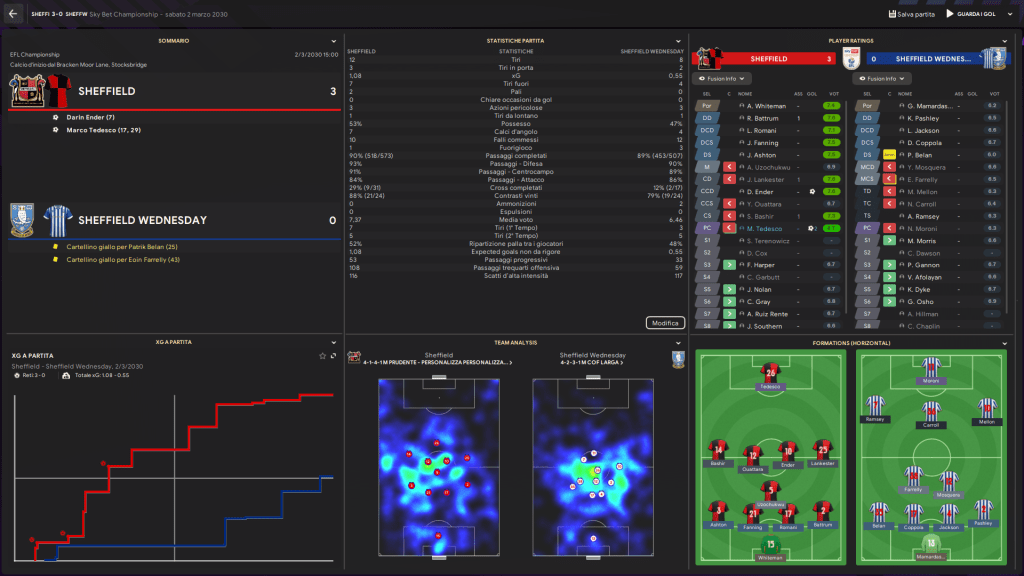 La partita più attesa dell’anno è durata solo 29 minuti. Il tempo necessario a Marco Tedesco per firmare una doppietta dopo il gol iniziale di Ender. Sheffield Wednesday annientato, umiliato tatticamente e messo alle corde senza appello. 3-0, con 1.08 xG trasformati in oro. Difesa imperforabile, solo tre tiri concessi. Il possesso equilibrato (53%) maschera un dominio verticale.