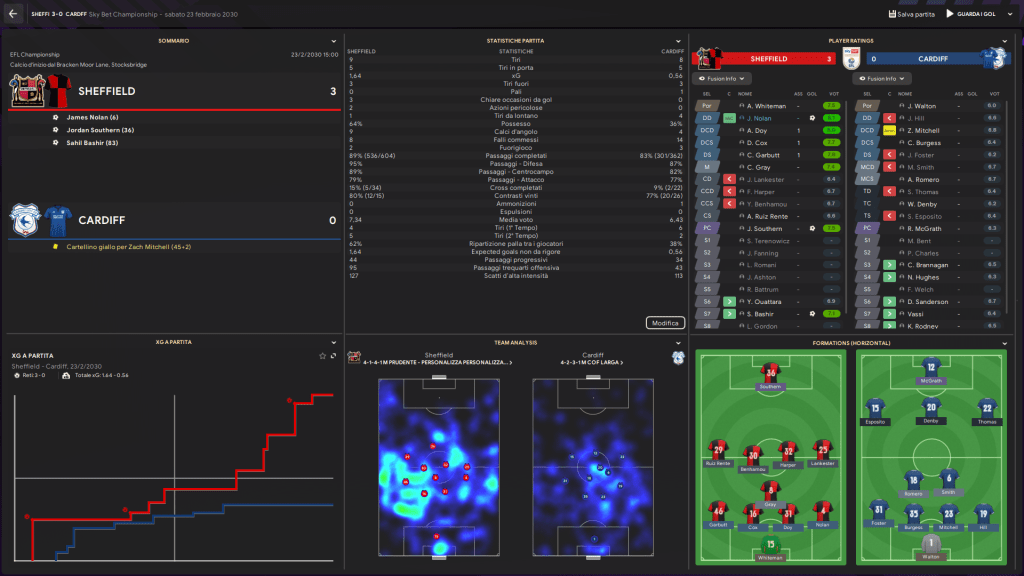 3-0 secco, con Nolan, Southern e Bashir a chiudere ogni discussione. Il 64% di possesso, 636 passaggi completati, 127 scatti ad alta intensità: numeri da macchina perfetta. Cardiff ha provato a resistere ma non è mai riuscita a respirare. L’xG parla chiaro: 1.64 a 0.56. Sheffield non è solo in forma. Sheffield è in controllo.