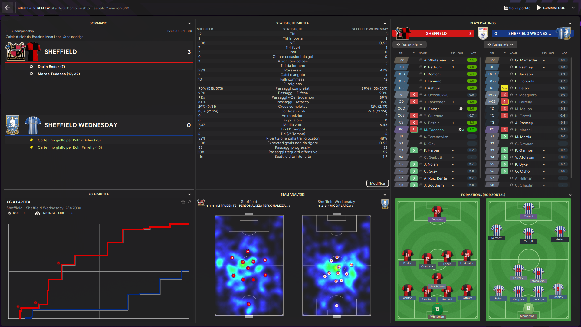 La partita più attesa dell’anno è durata solo 29 minuti. Il tempo necessario a Marco Tedesco per firmare una doppietta dopo il gol iniziale di Ender. Sheffield Wednesday annientato, umiliato tatticamente e messo alle corde senza appello. 3-0, con 1.08 xG trasformati in oro. Difesa imperforabile, solo tre tiri concessi. Il possesso equilibrato (53%) maschera un dominio verticale.