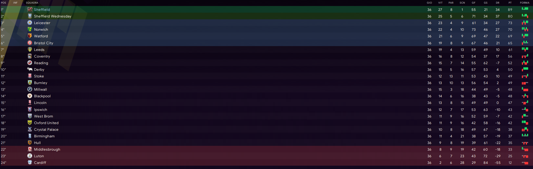 - 1° Sheffield – 89 punti, miglior difesa del campionato (21 gol subiti), 55 gol fatti.