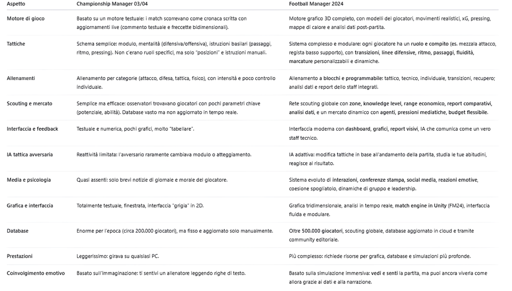FM24 è, in sostanza, Championship Manager 03/04 evoluto per 20 anni — lo stesso DNA, ma con tutto ciò che la tecnologia ha permesso di aggiungere.