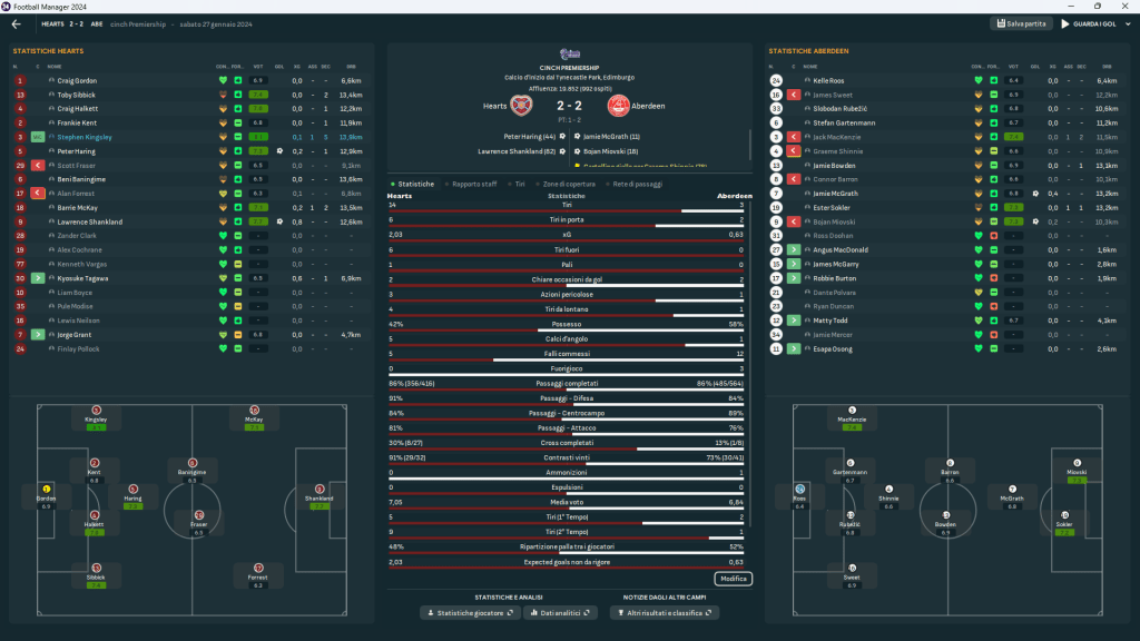 Gli Hearts hanno mostrato coraggio e intensità (13.9 km percorsi da Kingsley, 19 km da Forrest) ma poca lucidità in costruzione dal basso (solo 84% di precisione nei passaggi centrali contro l’89% avversario).