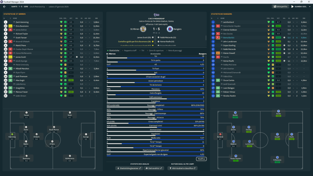 Il St Mirren ha avuto più possesso (55%), ma sterile, perché i Gers hanno gestito ogni transizione come un’operazione chirurgica: 4.01 xG, 21% di cross riusciti, 86% di contrasti vinti.