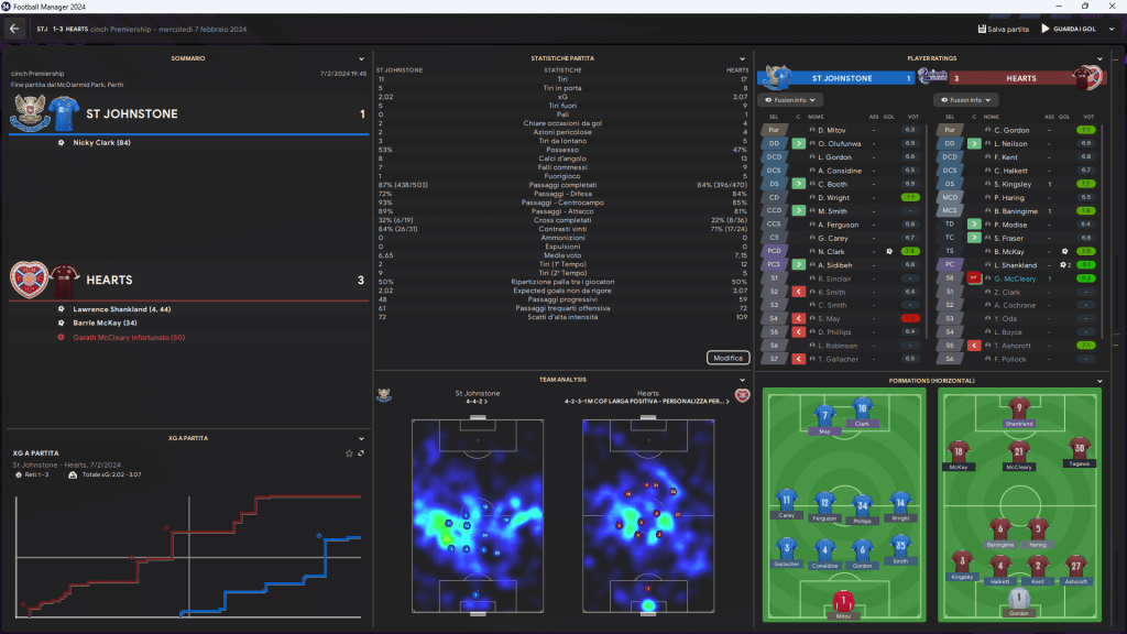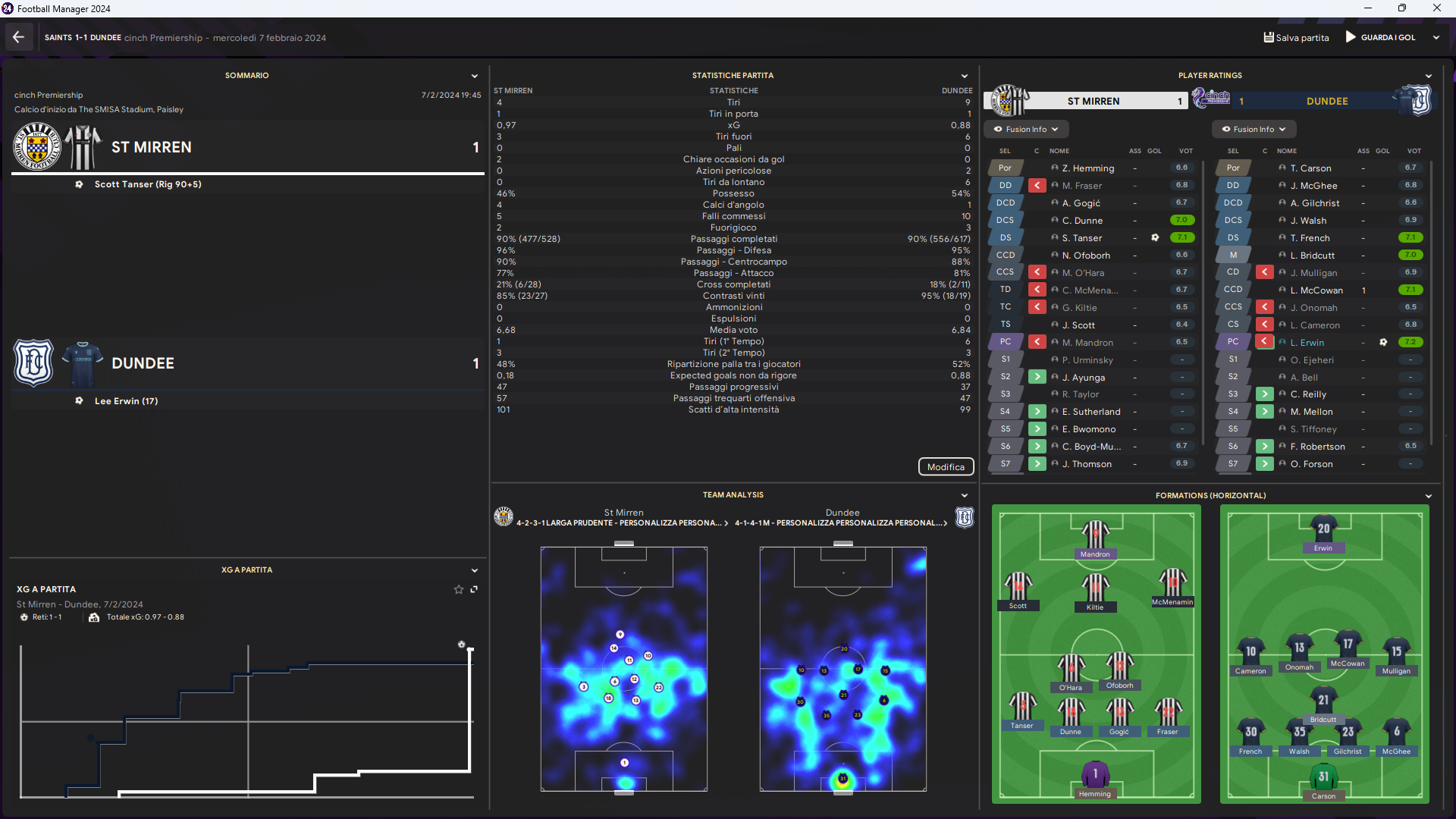 8 tiri totali, 3 nello specchio, 0.88 xG per il Dundee contro appena 0.18 xG del St Mirren, che fino al 80° aveva calciato una sola volta, e pure fuori bersaglio. Il primo e unico tiro nello specchio dei padroni di casa arriverà soltanto al 95°, proprio sul rigore trasformato da Scott Tanser per l’1-1 finale.