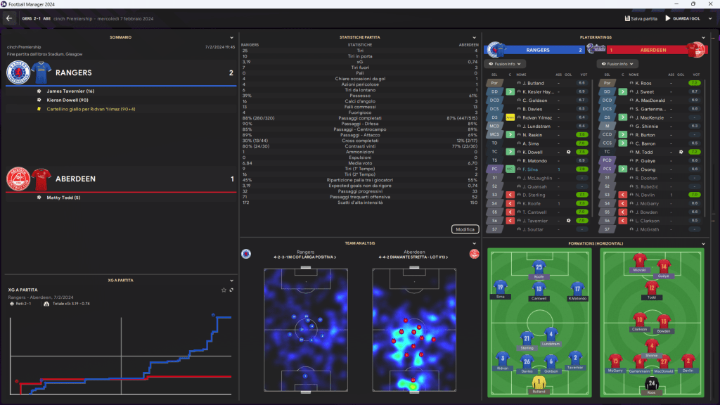 L’Aberdeen ha tenuto il campo con il suo 4-3-3 compatto, ma ha finito per abbassarsi troppo. I Gers, con un xG totale di oltre 3, hanno creato tanto, troppo, per non vincere.