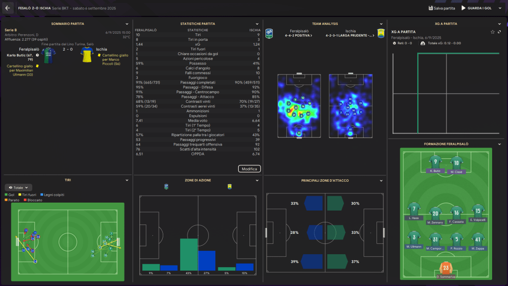 Con Feralpi Salò e Ascoli (entrambe schierate con il 4-4-2) vengono fuori due partite divertenti ed equilibrate. Affronto la Feralpi con il 4-2-3-1 per sfruttare l’assenza di mediani e trequartisti del loro modulo; la vincono di esperienza perché le occasioni (1,44 xg loro, 1,24 xg noi) dicono che forse un pareggio l’avremmo meritato. Con l’Ascoli opto per il 4-3-3, e qui usciamo con qualche rimpianto in più sia per le occasioni avute sia per non essere riusciti a sfruttare ancora il fattore campo.