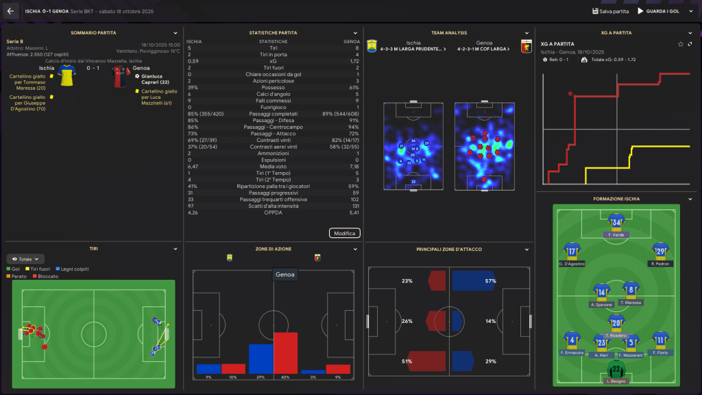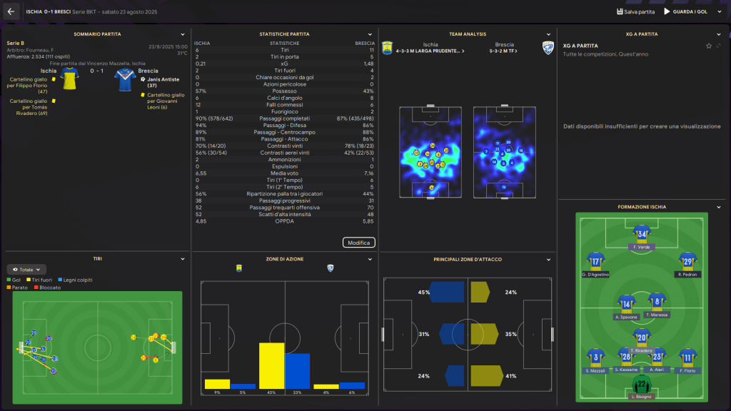 La prima partita della storia dell’Ischia in serie B finisce con una sconfitta. Proviamo a tenere palla, anche per prendere coraggio, ma il Brescia, quando attacca, arriva spesso al tiro. Al 27° minuto, il gol che decide la partita. Tanto lavoro da fare.