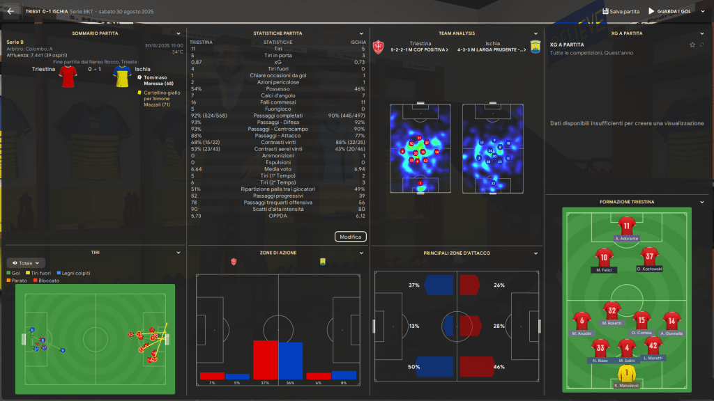 Dopo uno 0-0 contro il Lecco, nel quale avremmo meritato qualcosina in più (0 tiri in porta subiti), andiamo a ottenere la prima vittoria alla 3ª giornata contro la Triestina con una rete su calcio d’angolo e resistendo nel finale. Sfruttare le situazioni da palla inattiva sarà importante in quelle gare in cui non riusciremo a essere efficaci su azione manovrata.