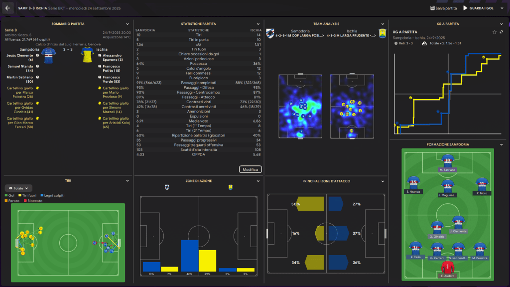 Altra trasferta durissima, contro la Samp che parte con un 4-2-3-1 con tutte le caratteristiche del gioco di posizione, che in fase di possesso diventa 3-2-5 con 2 esterni invertiti, un secondo mediano e un centromediano metodista. Ancora una volta, l’ottimo approccio alla gara ci porta in vantaggio, pareggiato immediatamente dai padroni di casa. La partita vive di fiammate, con la Samp che domina il possesso ma, come mai finora, andiamo facilmente al tiro; peccato che un paio di svarioni in difesa ci costino carissimo. La riacciuffiamo con un’altra rete da sviluppi di calcio d’angolo. Pareggio preziosissimo.