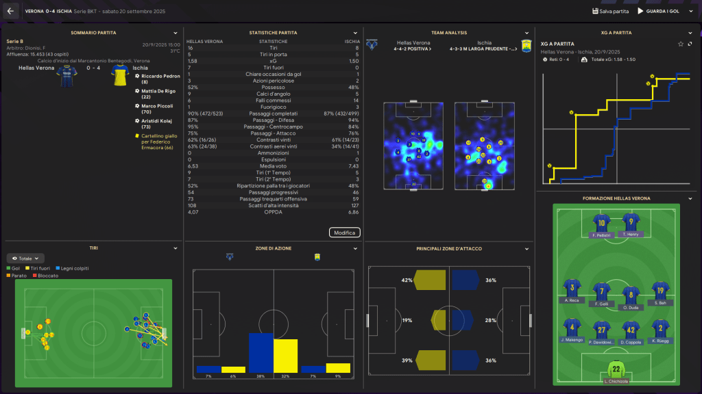 La tipica partita dal risultato già scritto. Ne affronteremo tante con questo presupposto. Ma è il campo, alla fine, a decretare chi vince. Partita giocata sulle transizioni, approfittando degli spazi che può lasciare un 4-4-2 d’attacco come quello scaligero. Sul 2-0 dopo circa 20 minuti proviamo a contenere la possibile rimonta, e nel finale arrotondiamo il punteggio, riuscendo per una volta a essere più cinici dell’avversario davanti alla porta.