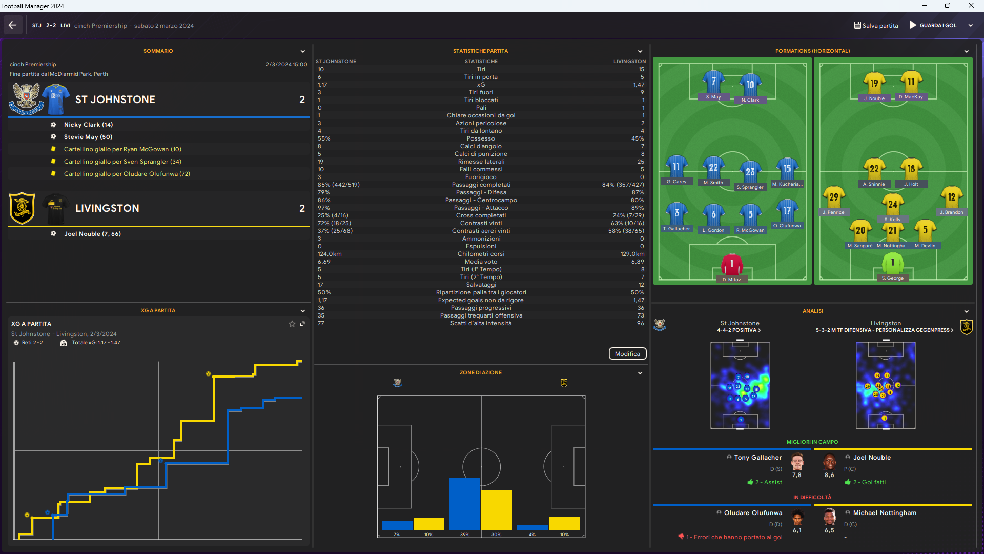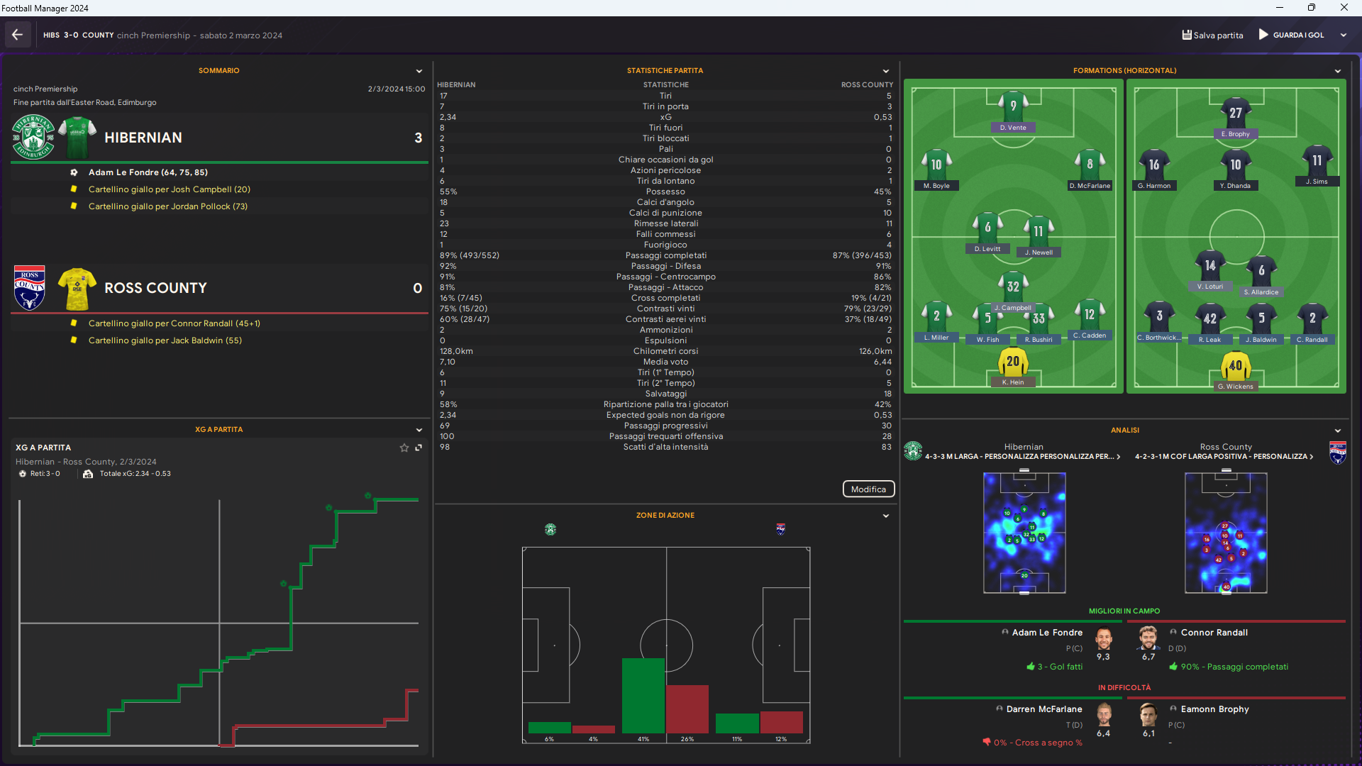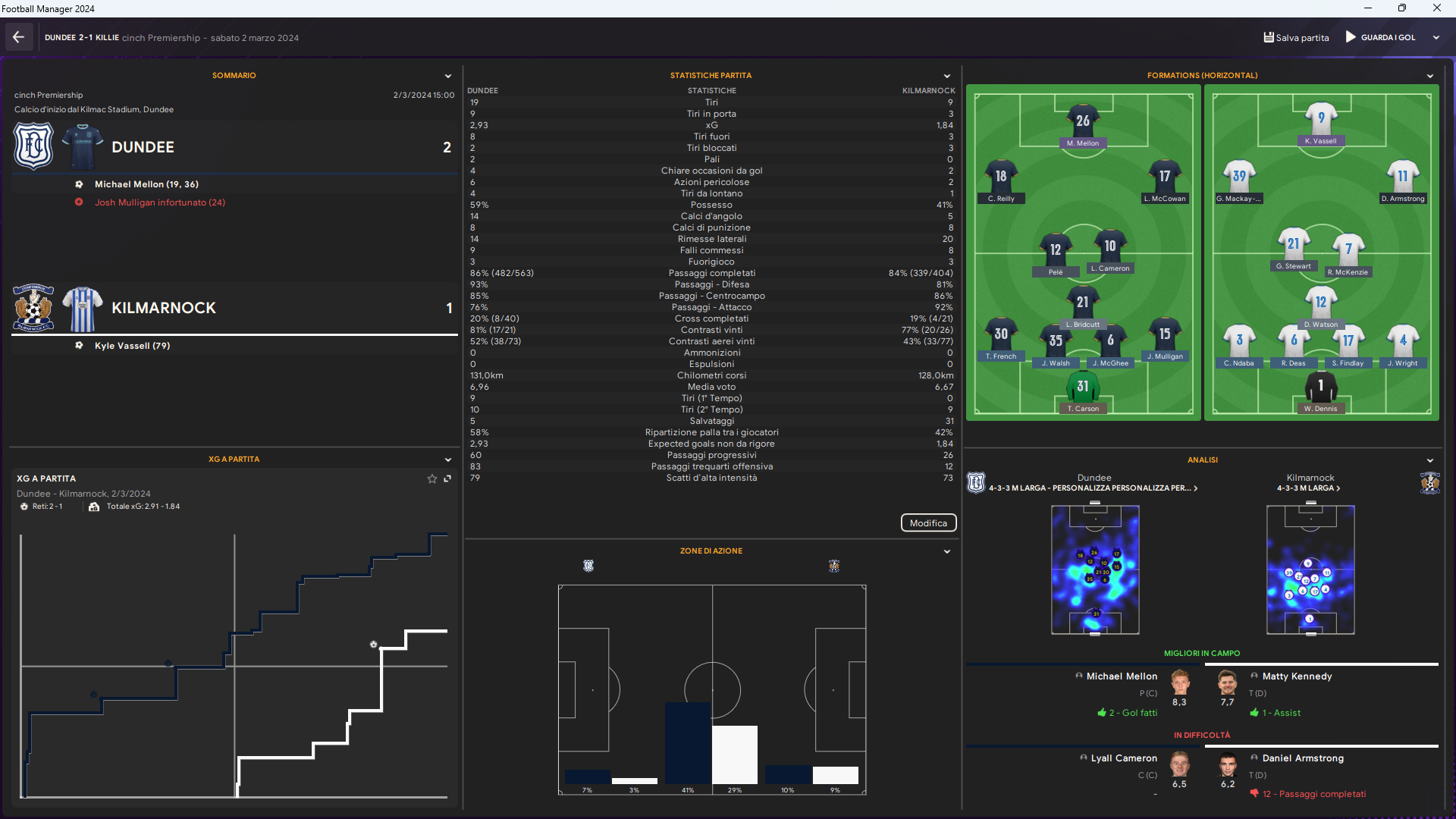 L’xG dice 2.91 a 1.84, ma la partita è stata più nervosa del previsto, anche per l’infortunio di Mulligan che ha costretto a cambiare i piani dopo appena 24 minuti e subito dopo di McCowen. Tre terzini su quattro infortunati per il Dundee.