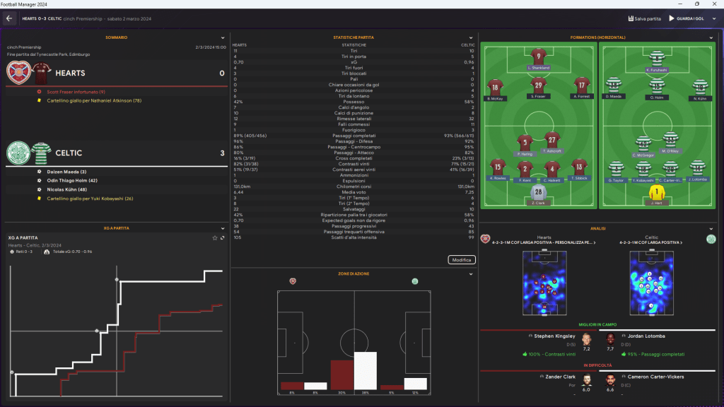 Il Celtic risponde con la stessa autorità: 3-0 a Tynecastle, tre colpi secchi, quasi una dichiarazione di intenti. La squadra di Rodgers gioca con fluidità, pressa alto e soffoca ogni linea di passaggio degli Hearts. Maeda apre, Holm e Kühn chiudono.