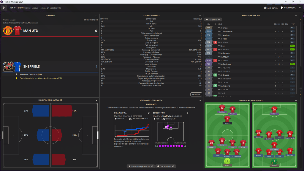 Lo United resta stabilmente nella nostra metà campo, ci costringe ad abbassarci, a difendere con ordine. Riconquistiamo palla, ma non riusciamo mai ad andare oltre la trequarti: le uscite sono sporche, le linee di passaggio si chiudono subito, ogni transizione muore sul nascere.