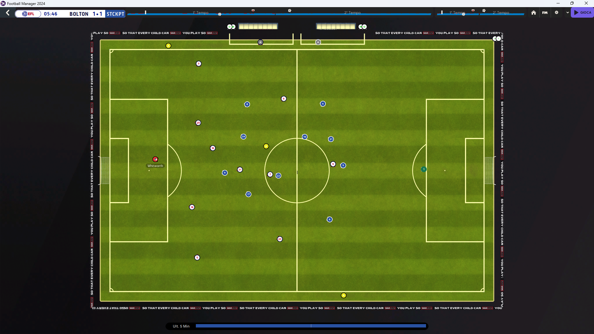 Decidiamo quindi di togliere il “più pressing” a tutta la linea di centrocampo e il meno pressing ai difensori centrali. Non per abbassarci o ridurre la pressione, ma per tenere compatta la squadra. Allo stesso tempo aumento leggermente il pressing di squadra, portandolo a poco di più, in modo da non perdere intensità, ma distribuirla in modo equilibrato tra i reparti.