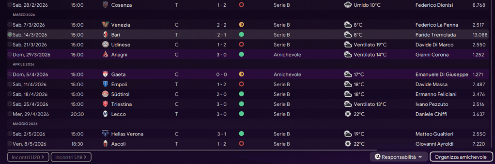 L’ultima partita di febbraio ci vede sconfitti dal Cosenza, in lotta per i playoff. Si passa in vantaggio su calcio d’angolo, il 3-5-2 avversario è molto affiatato e ci mette in difficoltà, proviamo almeno a portare a casa il pareggio ma vincono loro raddoppiando su rigore.