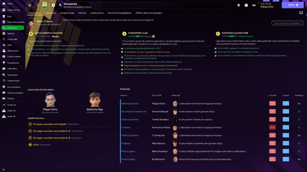 Ta alti e bassi siamo riusciti ad avere un ambiente abbastanza sereno nello spogliatoio. Alcuni degli scontenti andranno in scadenza o saranno ceduti.
