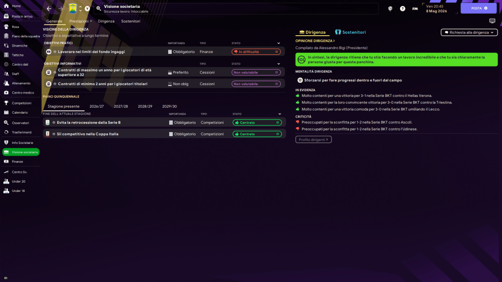 Riuscire a tenere la categoria era importante per non arrestare questo processo di crescita iniziato con la promozione in C. Il prossimo step sarà quello di consolidarci a questo livello e iniziare a creare profitti, per il momento tramite possibili plusvalenze che ci permettano di ottenere le risorse per investire nella crescita a 360° del club. Il nostro mercato sarà improntato alla cessione di calciatori non più utili o fuori dal progetto e all’acquisto di svincolati, possibilmente giovani, cercando di aumentare il livello in tutti i reparti, con un focus particolare sul terzino sinistro e in mediana dove non abbiamo titolari decenti.