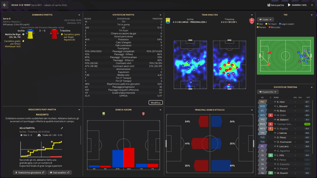 Proviamo a cancellare la delusione dell’ ultima sconfitta con una grande partenza contro il Venezia. Subito avanti di due gol, il primo con una triangolazione a tre sul centro destra, dopo una pressione ben fatta, tra ala centrocampista e punta con l’ala che entra in area sull’ imbucata vincente e segna. Raddoppio immediato con la verticalizzazione a scavalcare la difesa per la punta che batte in area il portiere avversario. Venezia che si riversa in avanti e nonostante poche conclusioni in porta riesce a trovare un pareggio che ci sta veramente stretto.