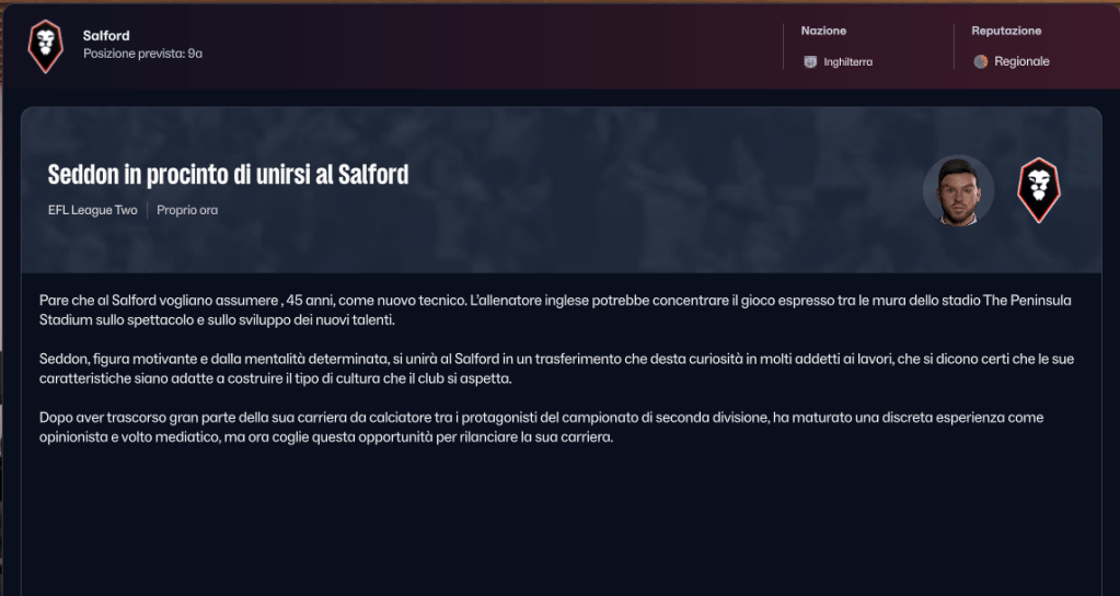 “ Sono passati 12 anni dal nostro approdo a Salford e di strada ne abbiamo fatta tantissima. Partiti dall’ottava divisione del 2014, da anni ci siamo assestati in League Two e siamo una presenza fissa della lega. Ma in quanto 1° tifoso del Salford e da persona che prende le decisioni, non mi posso accontentare di quello che abbiamo fatto… vogliamo di più e già da quest’anno vorremo puntare a fare un campionato di vertice. Insieme ai miei collaboratori, abbiamo deciso di cambiare la guida tecnica e di ingaggiare una nostra vecchia conoscenza….