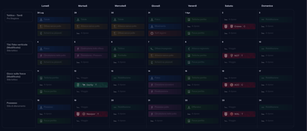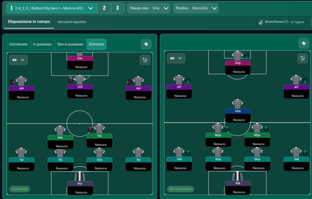 Il 4-2-3-1 sarà inizialmente il modulo con il quale partiremo. Un modulo che vede il DC di destra che imposta l’azione, due terzini che sostengono senza sbilanciarsi molto, due mediani davanti alla difesa che in fase di possesso ricoprono i ruoli di un regista e di un giocatore che si inserisce avanti sulla trequarti offensiva ed entrami in fase difensiva fanno da schermo alla difesa in maniera aggressiva, uscendo in pressing e difendendo in avanti. Davanti a loro due esterni a piede invertito e un trequartista che dovranno fornire i palloni per il nostro centravanti.