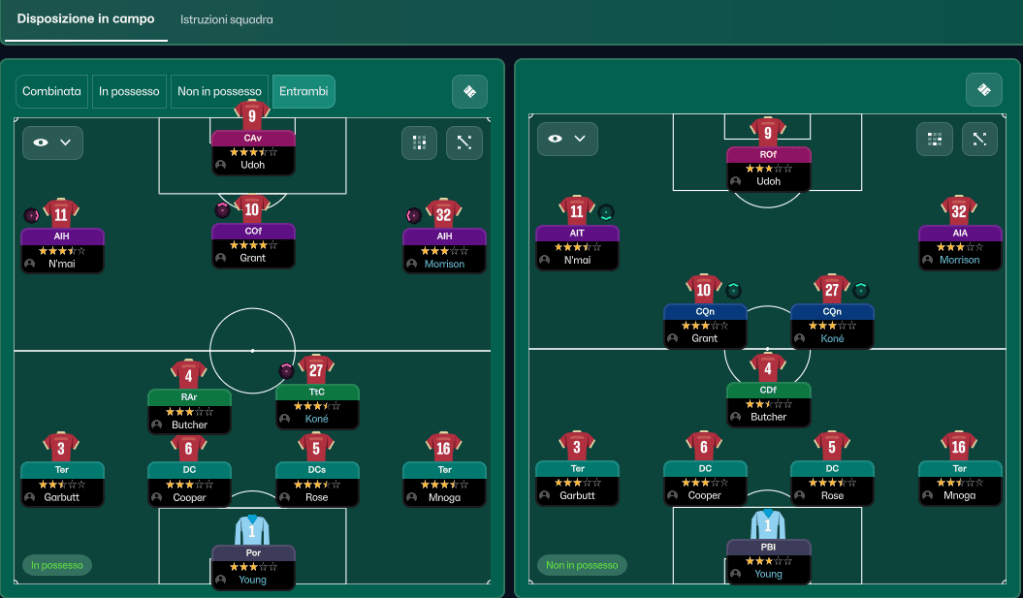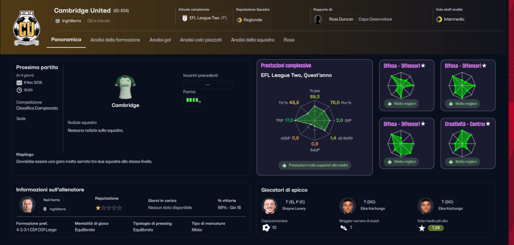Una squadra in cui mister Harris applica un 4-2-3-1 basato sul possesso della palla, molto forte nei calci piazzati