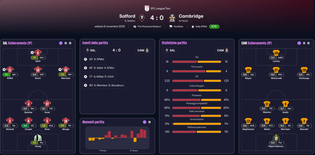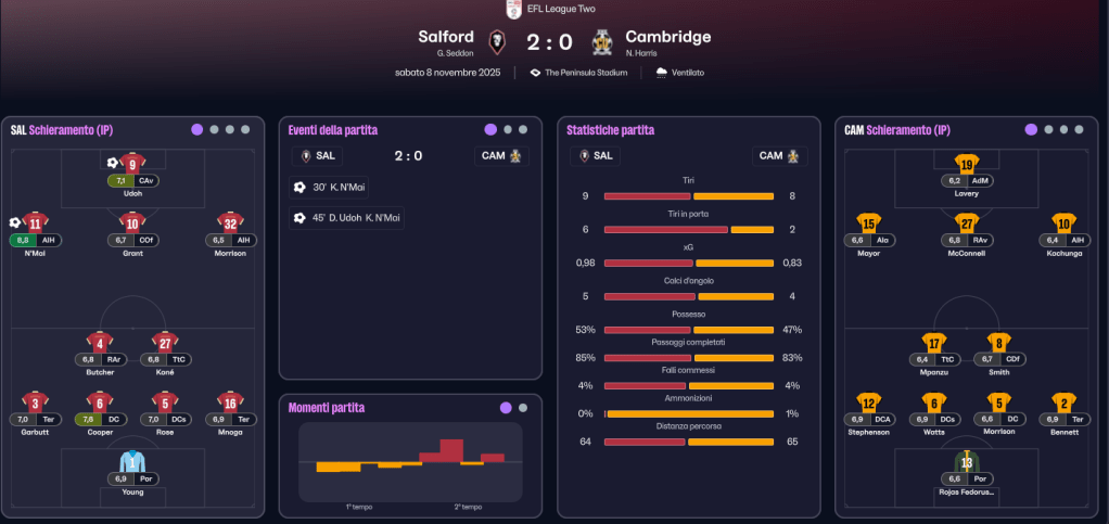 Nella ripresa il canovaccio non cambia. La chiudiamo con una bellissima azione: un 1-2 tra N’mai e Udoh che porta il primo da solo in area dove con un diagonale batte il portiere giallonero per il gol del 3-0. A tempo scaduto, c’ è spazio anche per il poker: sugli sviluppi di un corner, la palla arriva fuori area, Woodburn tira e Morrison è più lesto di tutti in mischia, a metterci la zampata e correggere in gol il tiro del gallese che altrimenti sarebbe finito sul fondo. Finisce cosi…con un poker…. il big match della 15a giornata.
