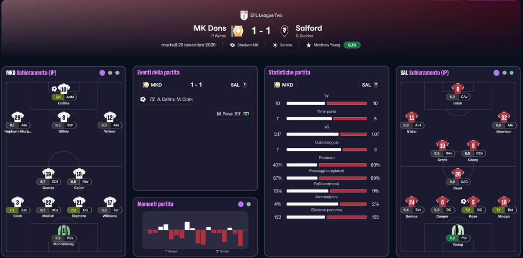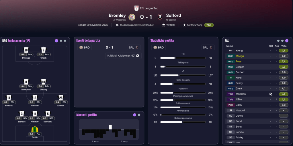 Si ritorna in campo in League two e ritorniamo alla vittoria, seppur per 1-0. Scegliamo di mantenere il posseso, infatti ben 70% di possesso palla, che ha portato ad essere preoccupato, finche non riusciamo a sbloccarla con Morrison e ci portiamo a casa i 3 punti.