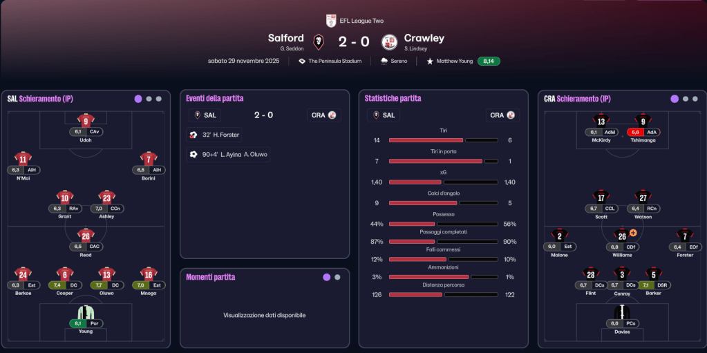 Al Peninsula stadium, contro il Crawley, schieriamo in difesa Oluwo, che sostiuirà Rose durante il suo infortunio. Dominiamo la gara, andando prima in vantaggio con un autogol di Foster e poi chiudendola nel momento più delicato, al minuto 90+4, con Ayna su assist di Oluwo. Siamo in testa da soli!