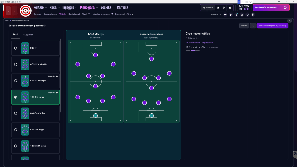 Ma qui questo approccio è pericoloso. Se continui a ridisegnare da zero sia la fase in possesso che quella senza palla ogni volta che attraversi un momento difficile, i giocatori non costruiranno mai automatismi e tu non svilupperai mai una vera comprensione del sistema.In FM, la pre-stagione non è un periodo di prova casuale: è il momento in cui la tua idea diventa realmente una struttura di gioco.