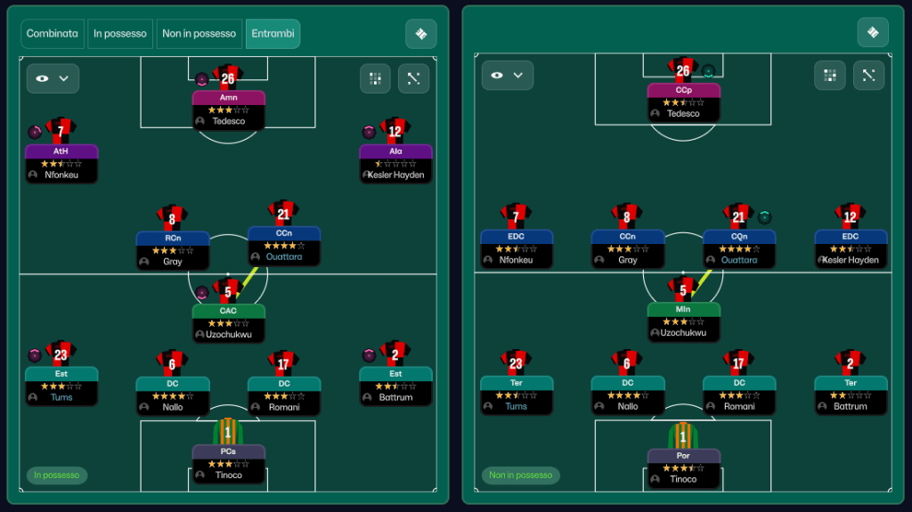 - 3-2-4-1 in possesso → 5-4-1 o 4-4-2 senza palla per maggiore copertura sulle fasce