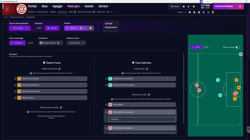 La rivoluzione tattica di FM26 arriva anche sui calci piazzati. Il sistema è stato portato allo stesso livello di dettaglio del resto della tattica, con maggiore controllo sulle assegnazioni e comportamenti più chiari dentro l’area.