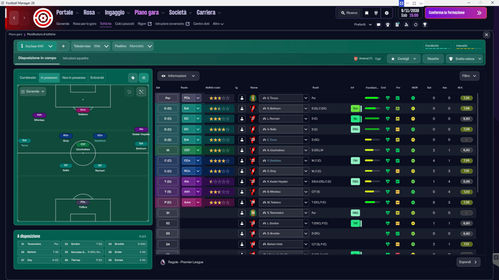 La schermata tattica è diversa. Niente più “duties”. Due formazioni ti guardano invece di una sola. Schede separate per In Possesso e Non Possesso. E una nuova funzione chiamata Visualiser, che mostra i giocatori muoversi su una griglia come magneti su una lavagna tattica. L’insieme sembra come se la lavagna di Guardiola avesse avuto un figlio con un designer di interfacce.